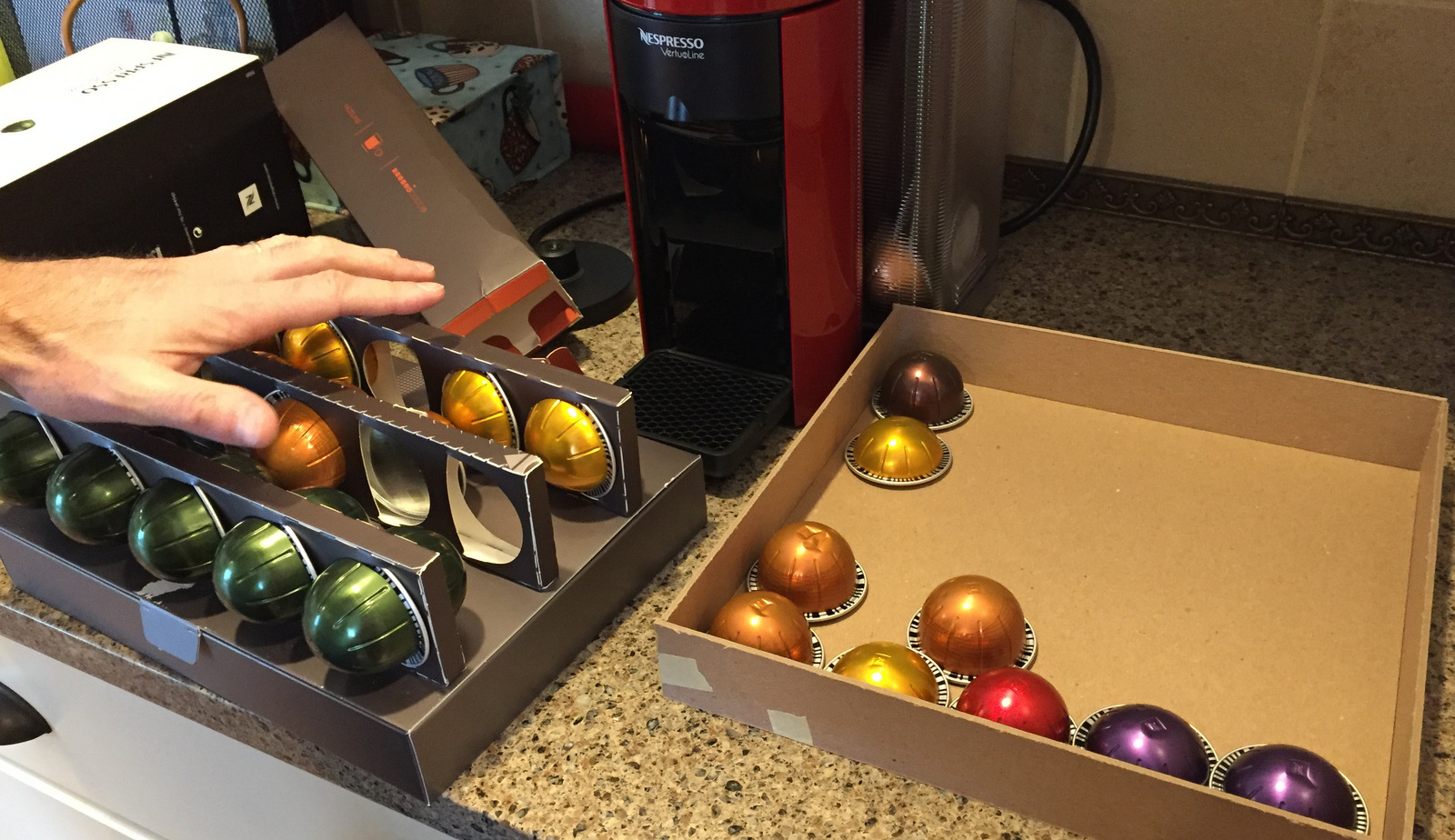 First, he loves coffee and decided to have a new coffee machine for our house! After searching he found the best choice would be the Nespresso  Vertuoline. He started making very good coffees, but the capsules were kind of big to fit in the boxes I already made, and for sure, I didn’t want to buy a new one, as I could have fun and make my own one by Cartonnage! But I didn’t want to make just “another box”, I want to make something functional and beautiful! But I didn’t have time for that….then, for the last two weeks, my countertop was a mess……literally….  Some weird boxes around, so difficult to find the coffee he wanted...